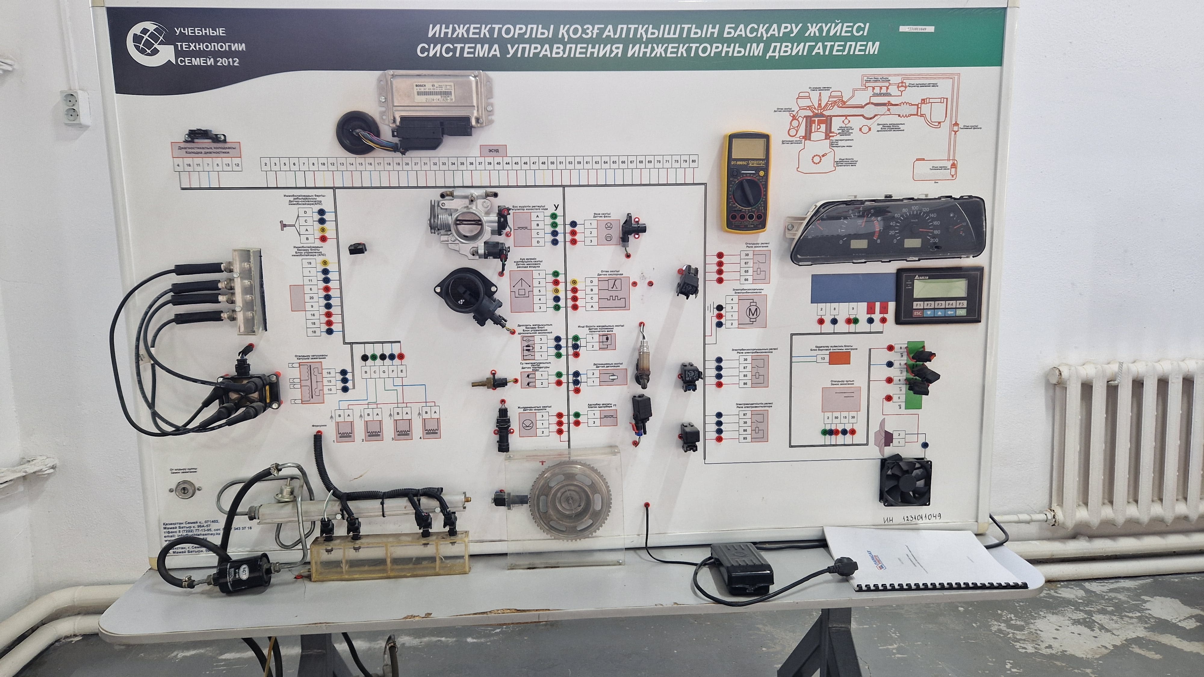 12 жұмыс орны жабдықталған. Шеберханада техникалық оқыту құралдары (экраны бар жиынтықтағы диапроектор), автомобиль тораптарының макеттері, оқушылардың сыныптық инвентары, құрал-саймандарға арналған металл шкафтар, 25А зарядтағыш, оқу стендтері орнатылған.
